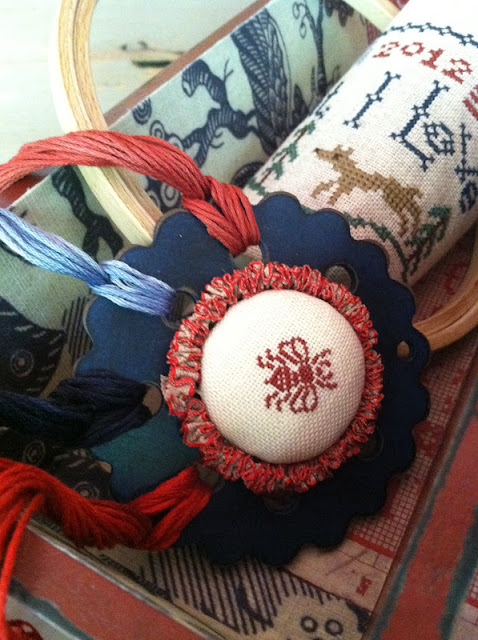 | Clara made some of these darning pincushions and gave me one with a French Bee motif stitched on it. Love it! |